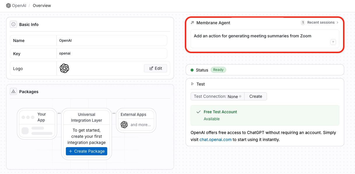 Use the Membrane Agent in the Membrane Console to build out the required integration logic and generate configured Membrane interfaces (Actions, Flows, etc.)