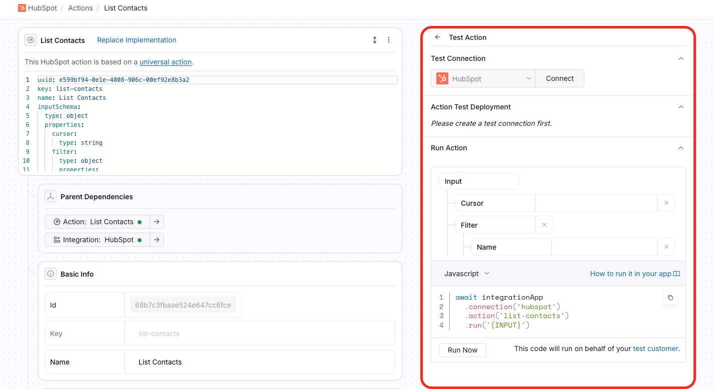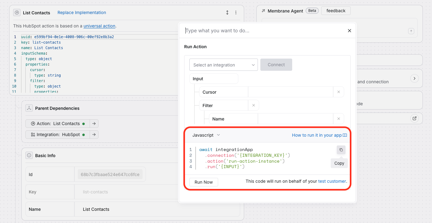 Once the integration logic is generated, you can copy the SDK calls for each interface (actions, flows, etc.) directly from the Console: