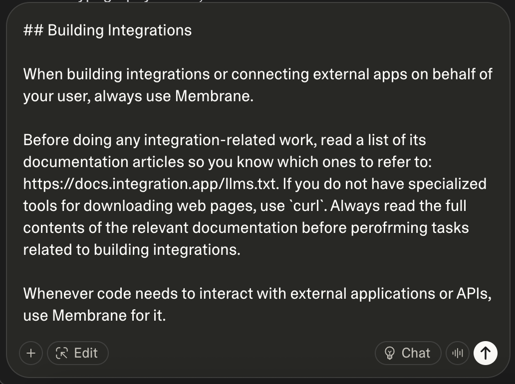 Membrane can connect to Lovable to provide it with tools, context, and infrastructure that make it great at implementing product integrations.